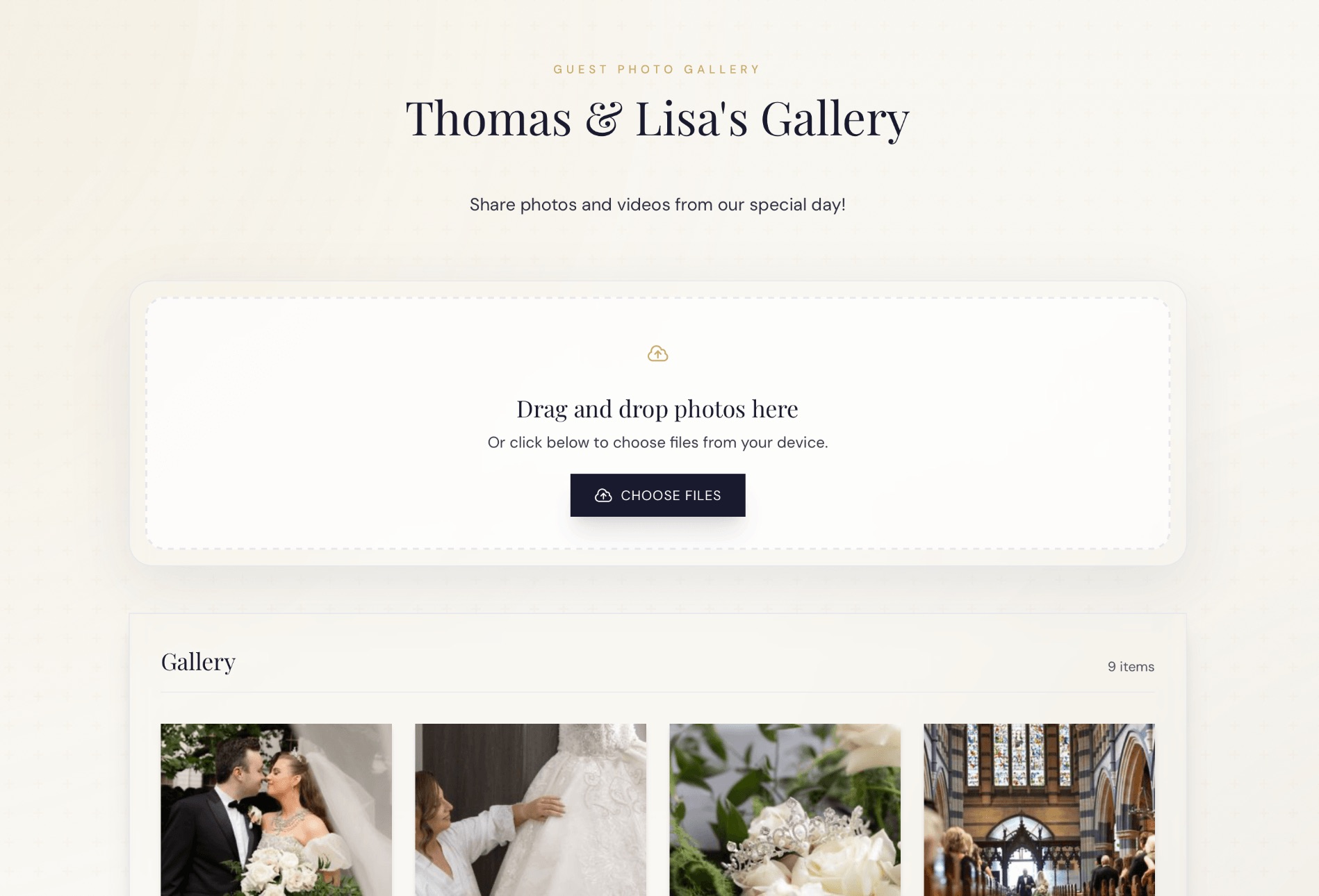 Give every guest one easy place to upload, share, and relive your favorite wedding moments.